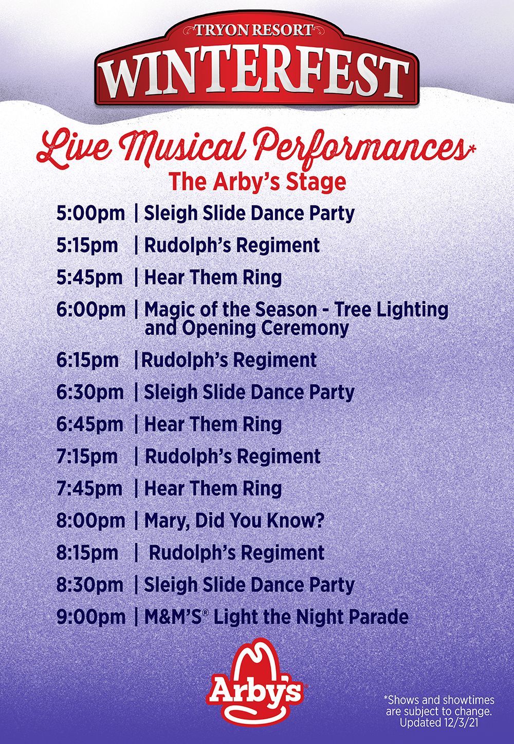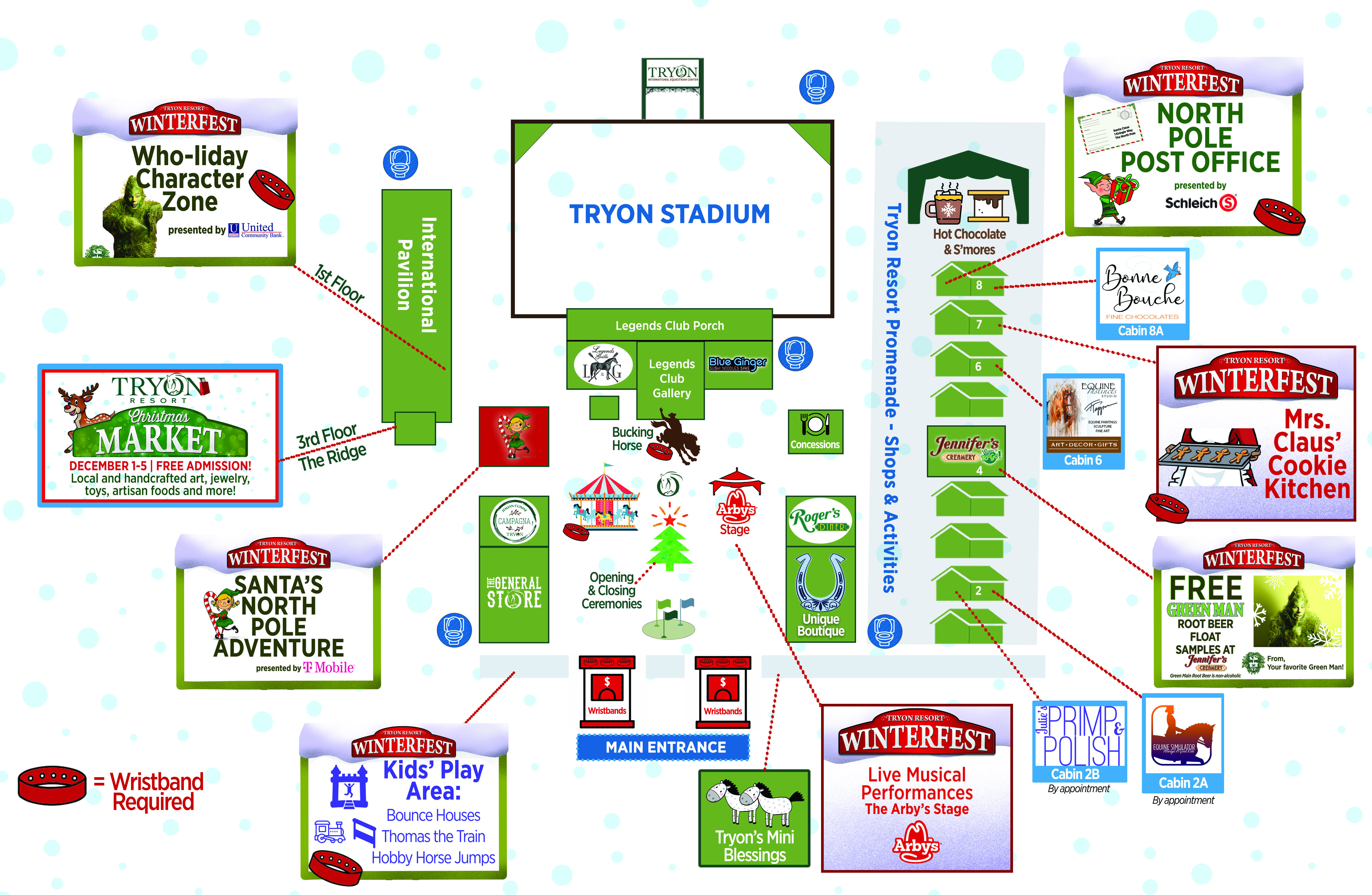 Tour the light show, then park and take in the magic of the holiday season with us in Legends Plaza, the heart of Tryon Resort, at the 2021 Winterfest Village.